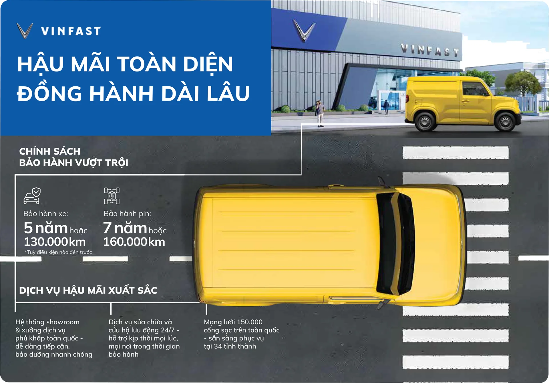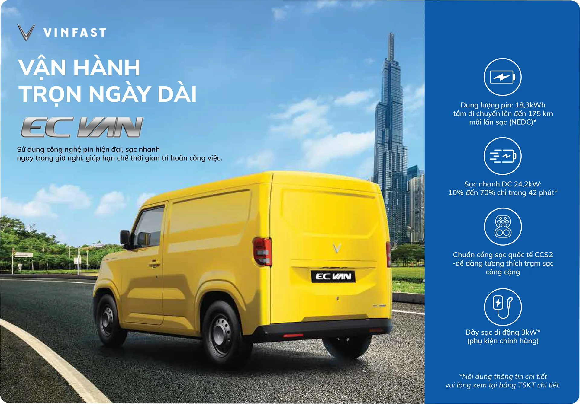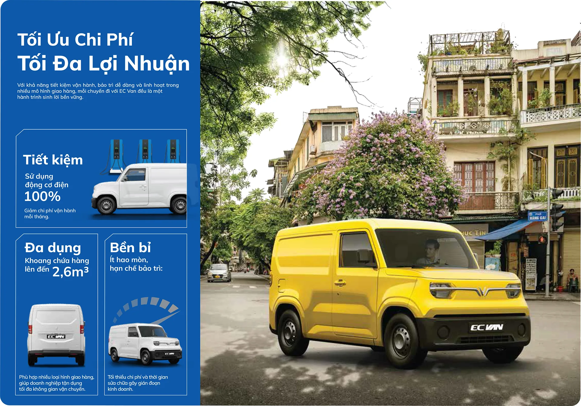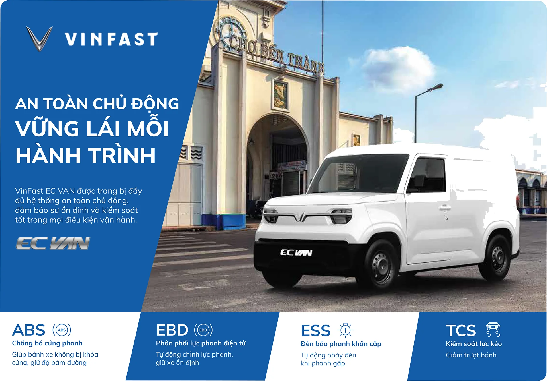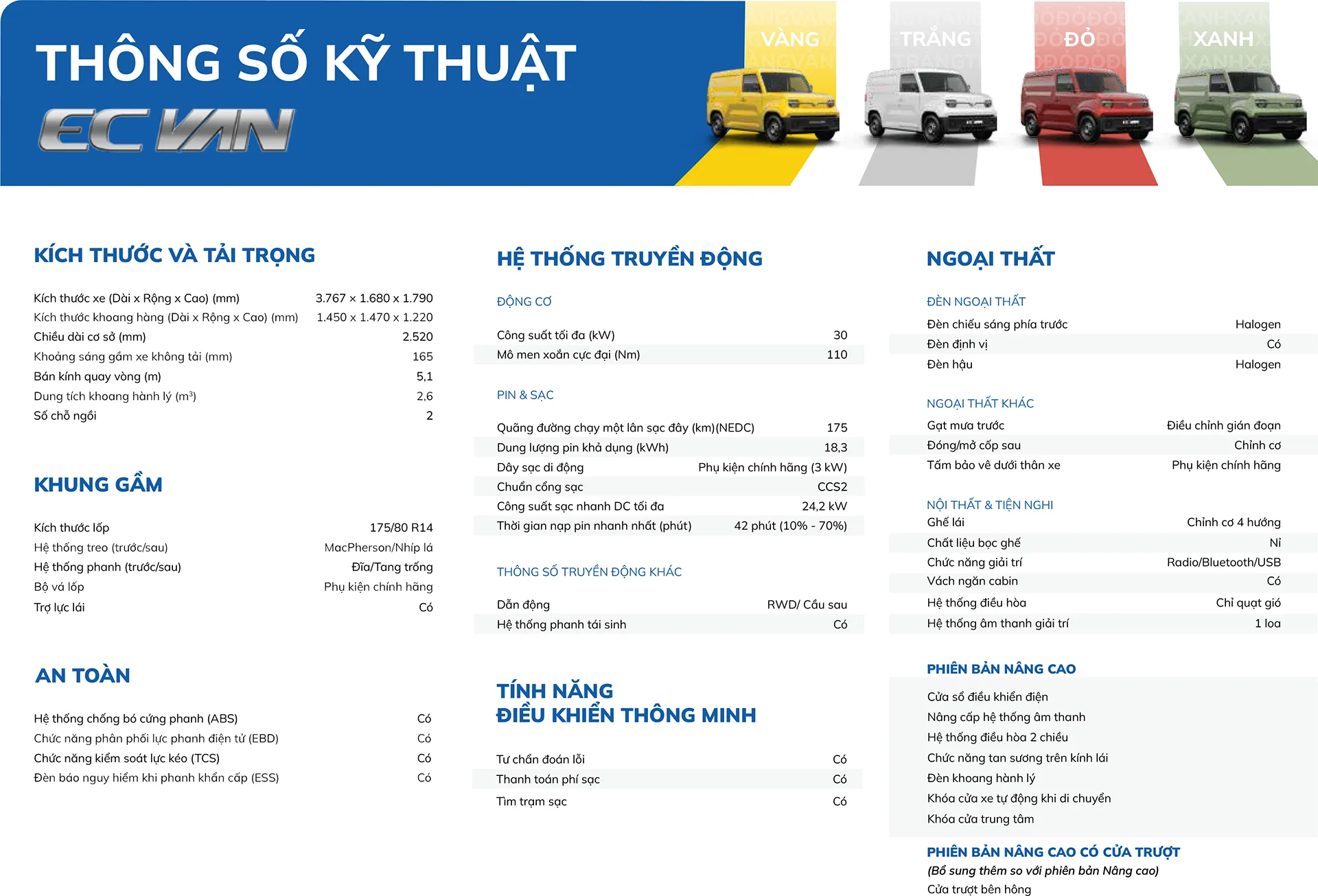 EC Van tiên phong mang đến giải pháp vận chuyển thương mại đột phá, nổi bật với khả năng vận hành linh hoạt, êm ái và tiết kiệm chi phí. Sở hữu thiết kế hiện đại, tiện dụng cùng bảng màu ngoại thất với 4 lựa chọn nổi bật Xanh – Vàng – Trắng – Đỏ, EC Van không chỉ là phương tiện di chuyển mà còn là đối tác tin cậy, phương tiện sinh kế phù hợp cho kinh tế hộ gia đình, doanh nghiệp.